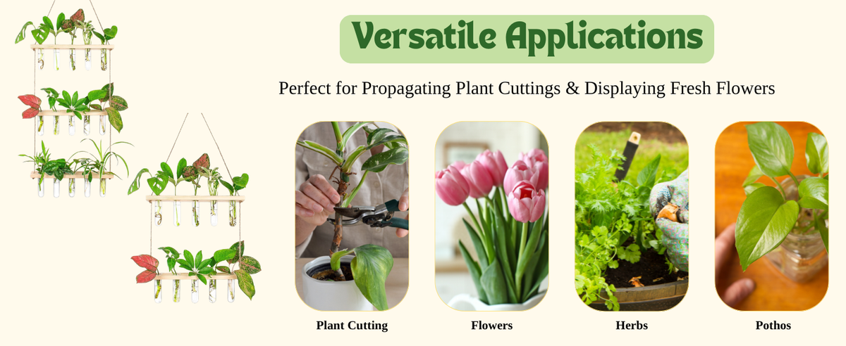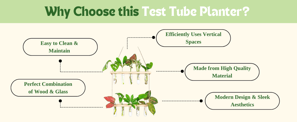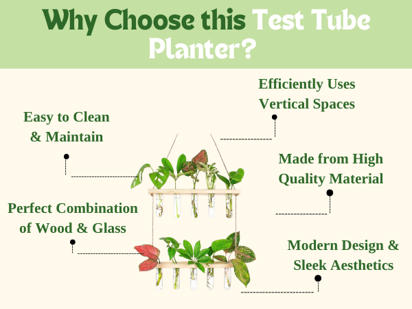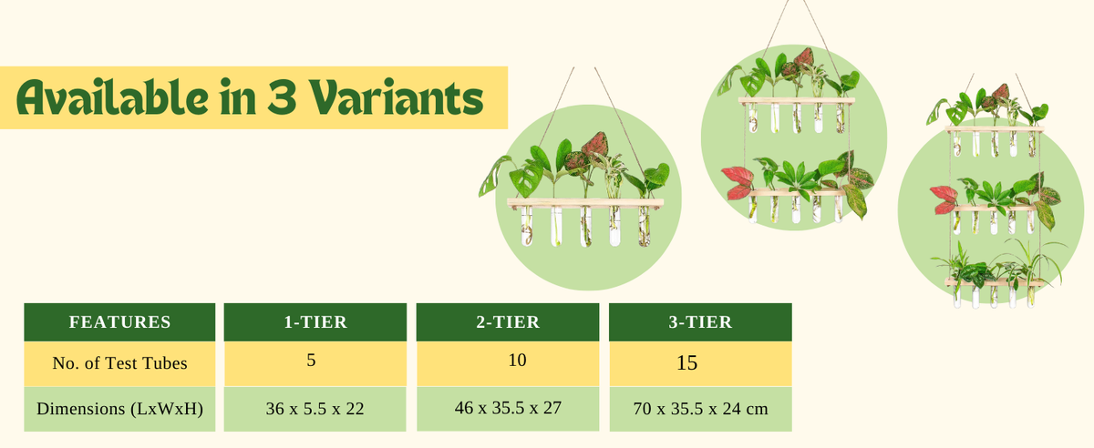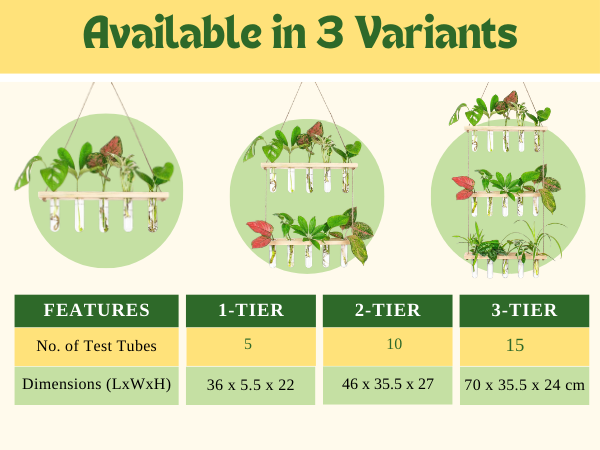 Crafted with transparent glass tubes, natural wooden shelves, and strong jute rope, the planter blends clean minimalism with warm, organic textures. Simply fill the test tubes with water, place your plant cuttings, and enjoy a low-maintenance green display that thrives without soil. It’s ideal for money plant, pothos, philodendron, lucky bamboo, herbs, and other water-rooting plants.
