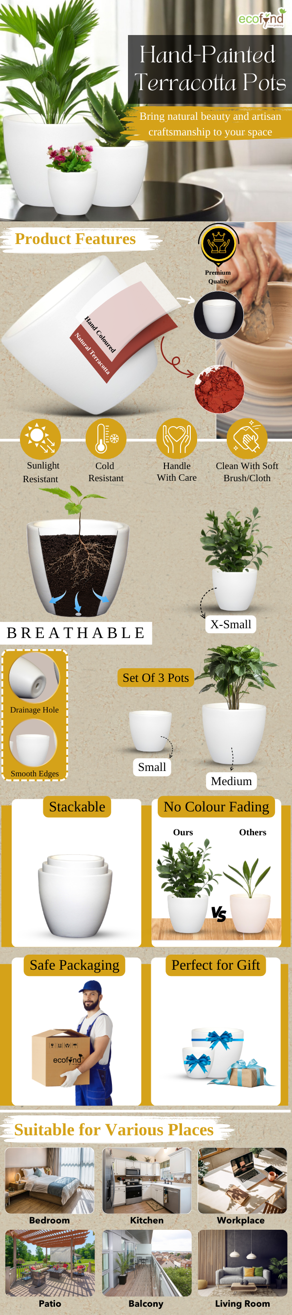 Our terracotta pots prevent overwatering, promote root health, and are lightweight for easy movement indoors or outdoors. Made from durable, eco-friendly clay, they’re perfect for any space living room, garden, or office and easy to maintain with simple cleaning. Enjoy a sustainable, stylish choice for healthy, vibrant plants.
