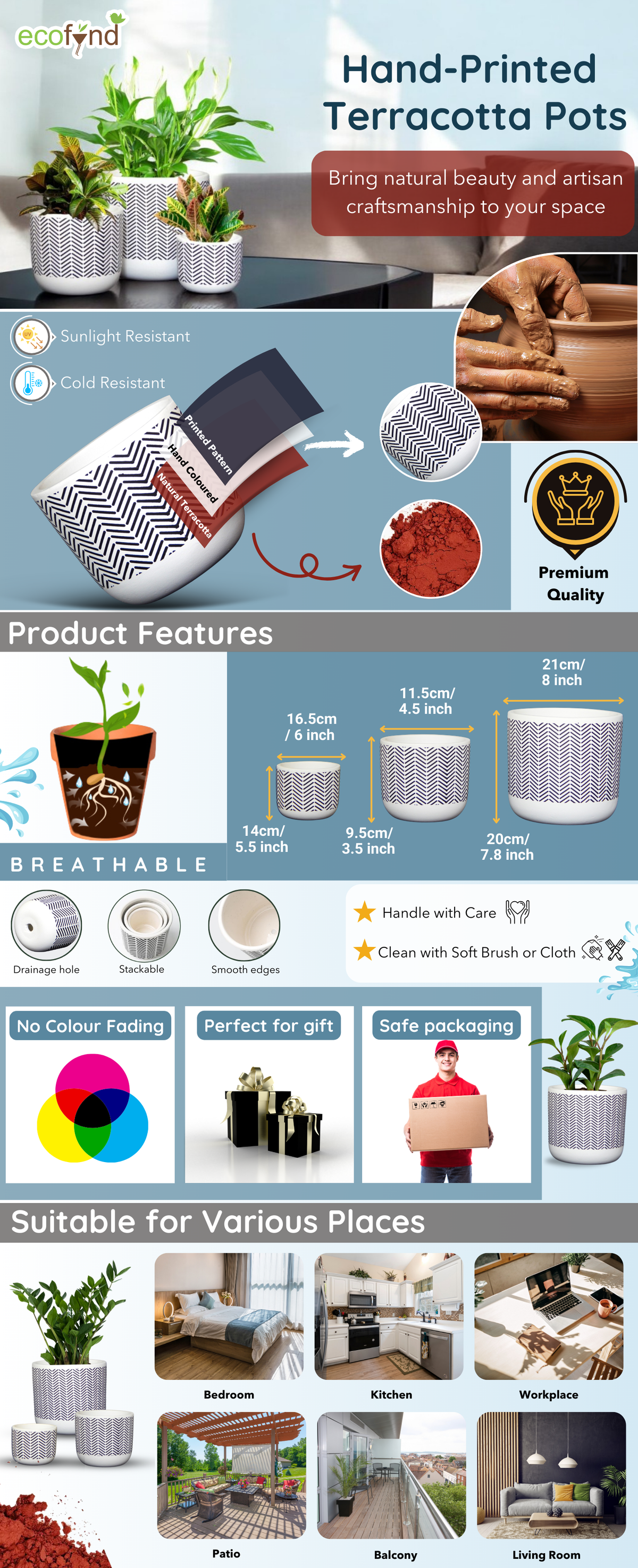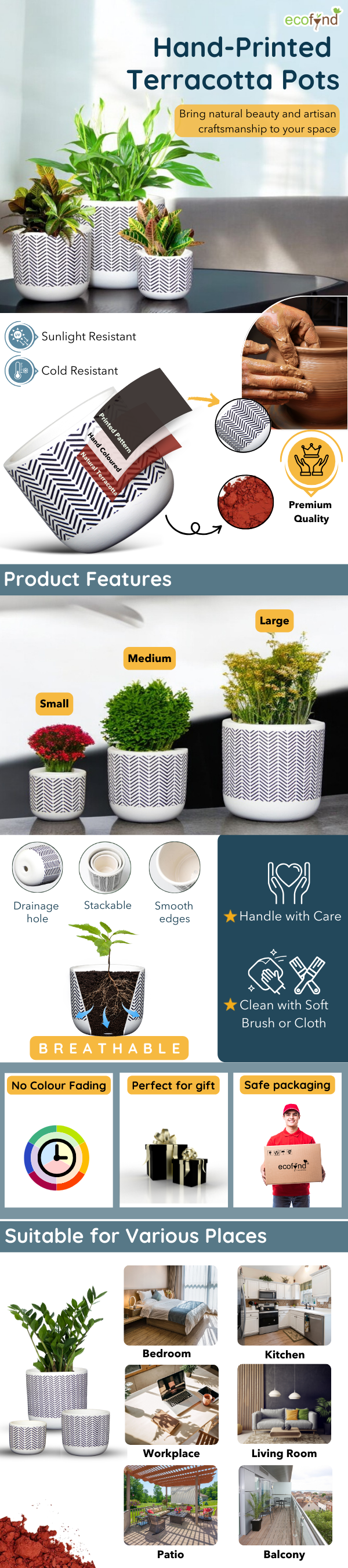 Our terracotta pots prevent overwatering, promote root health, and are lightweight for easy movement indoors or outdoors. Made from durable, eco-friendly clay, they’re perfect for any space living room, garden, or office and easy to maintain with simple cleaning. Enjoy a sustainable, stylish choice for healthy, vibrant plants.