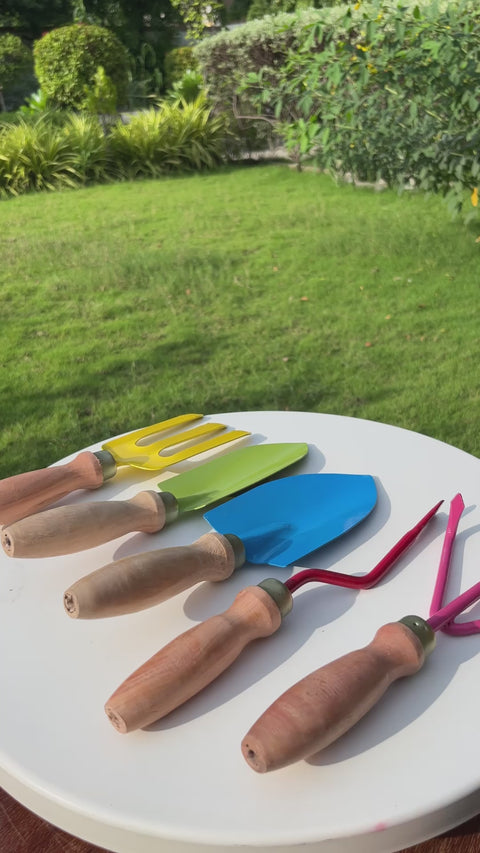 This set includes 5 tools: cultivator, big trowel, small trowel, fork, and weeder—covering all essential gardening tasks.